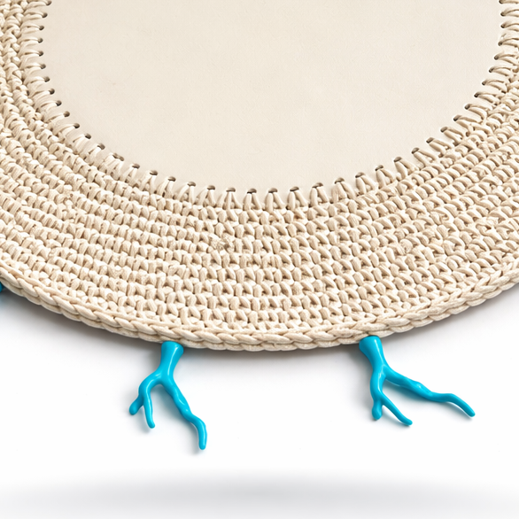 Mantel Individual Redondo Tejido a Mano en Cuerda de Cuero Crema con detalle Coral Turquesa